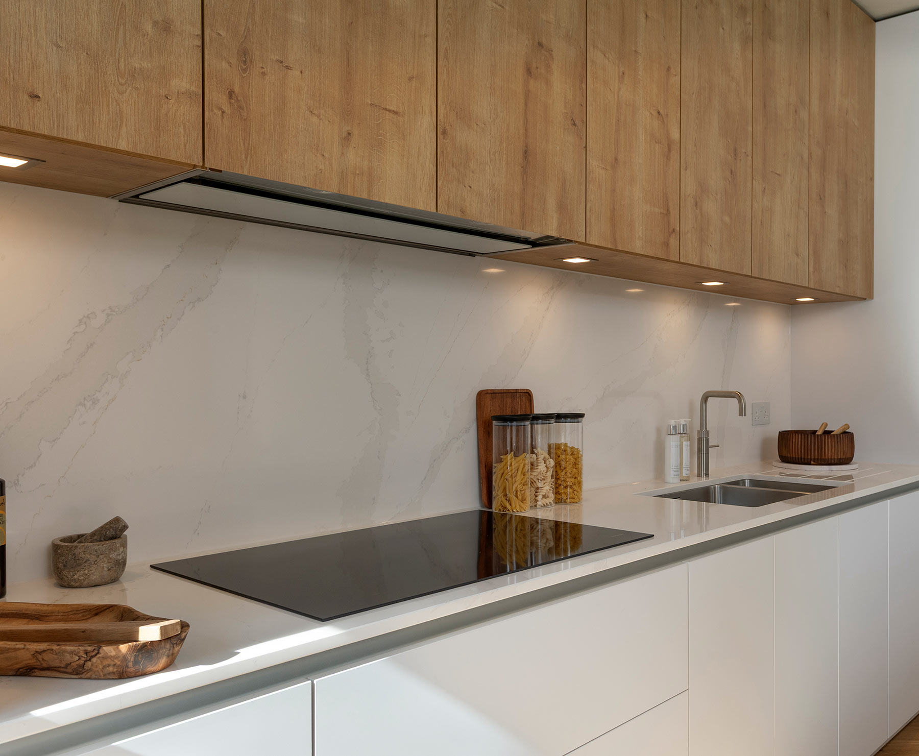 The bespoke Leicht kitchen is finished to the highest standard, featuring integrated Siemens appliances, quartz stone worktops and refined stainless steel detailing.