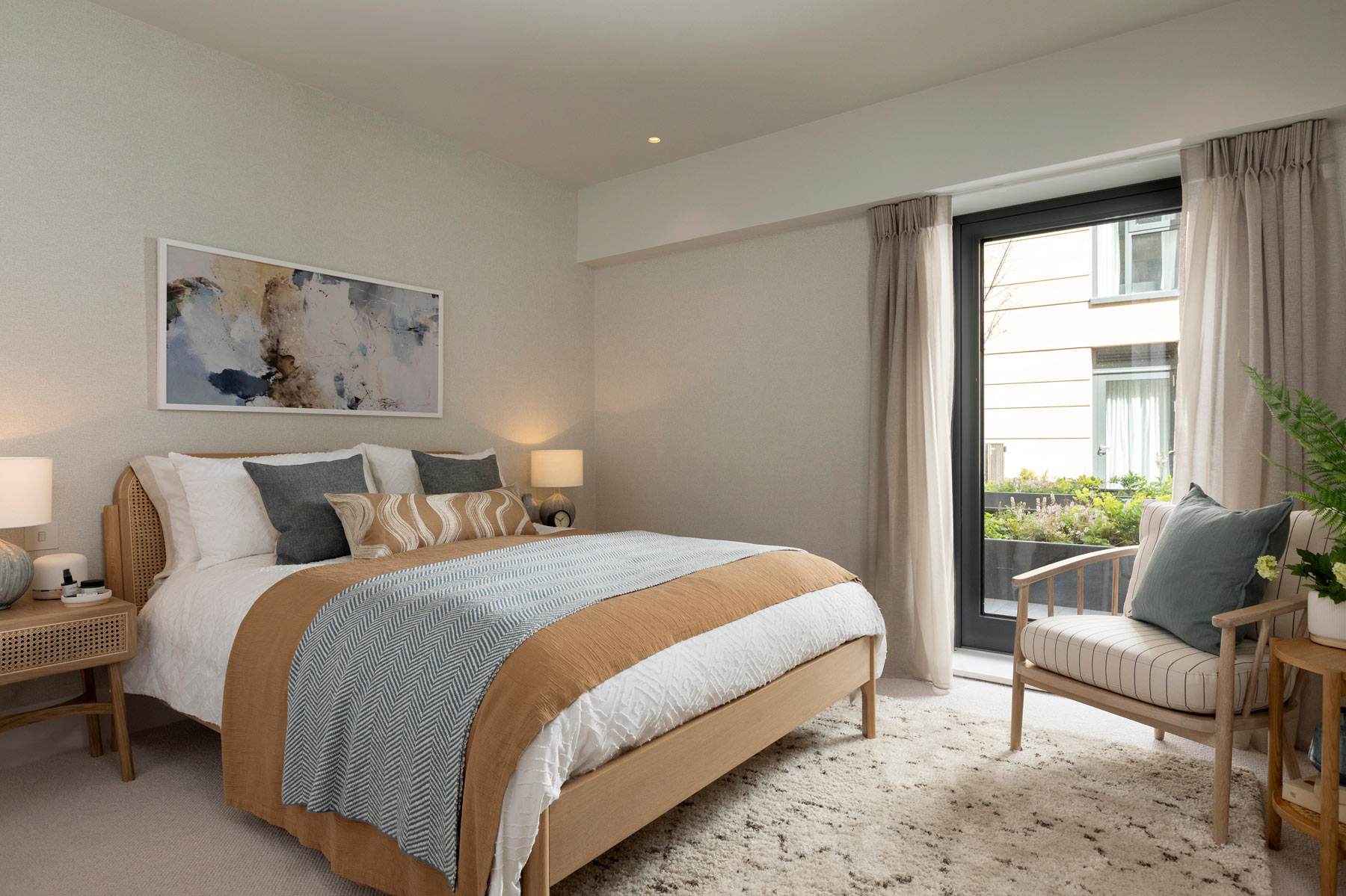 This elegant one-bedroom apartment reflects the character and vibrancy of its setting, defined by a commitment to quality, craftsmanship and original design. The open-plan reception, dining and kitchen space offers a refined contemporary living environment, with a north-east aspect framing views of the striking architecture of the Galleria.